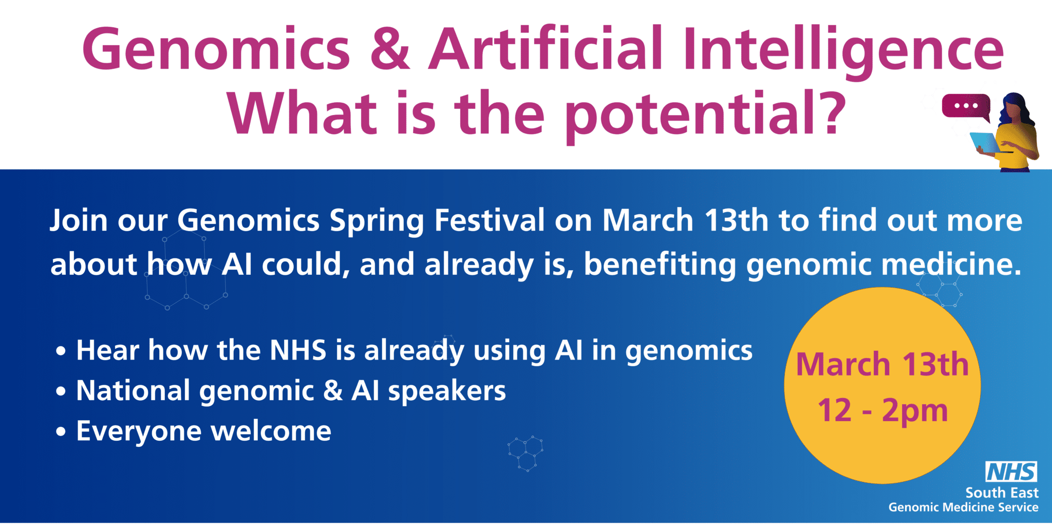 Join us on 13th March to hear about the exciting potential of AI in genomics! Our range of expert speakers will be sharing their insights on the role of AI in genomics and how this can be adopted by the NHS.